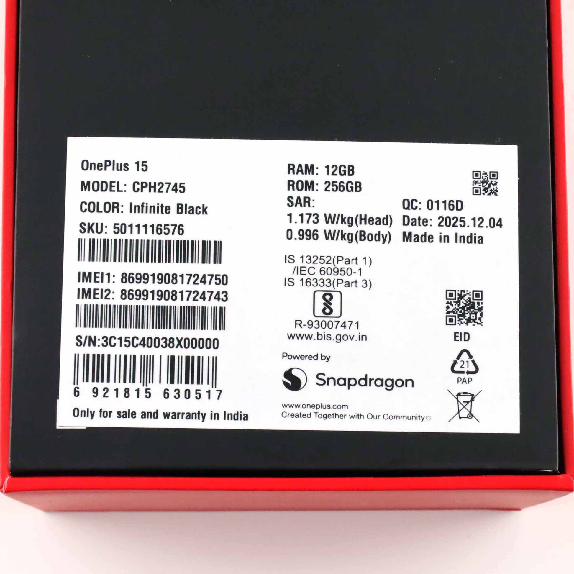 A-ランク OnePlus 15 12/256GB InfiniteBlack CPH2745 グローバル版【90日保証】