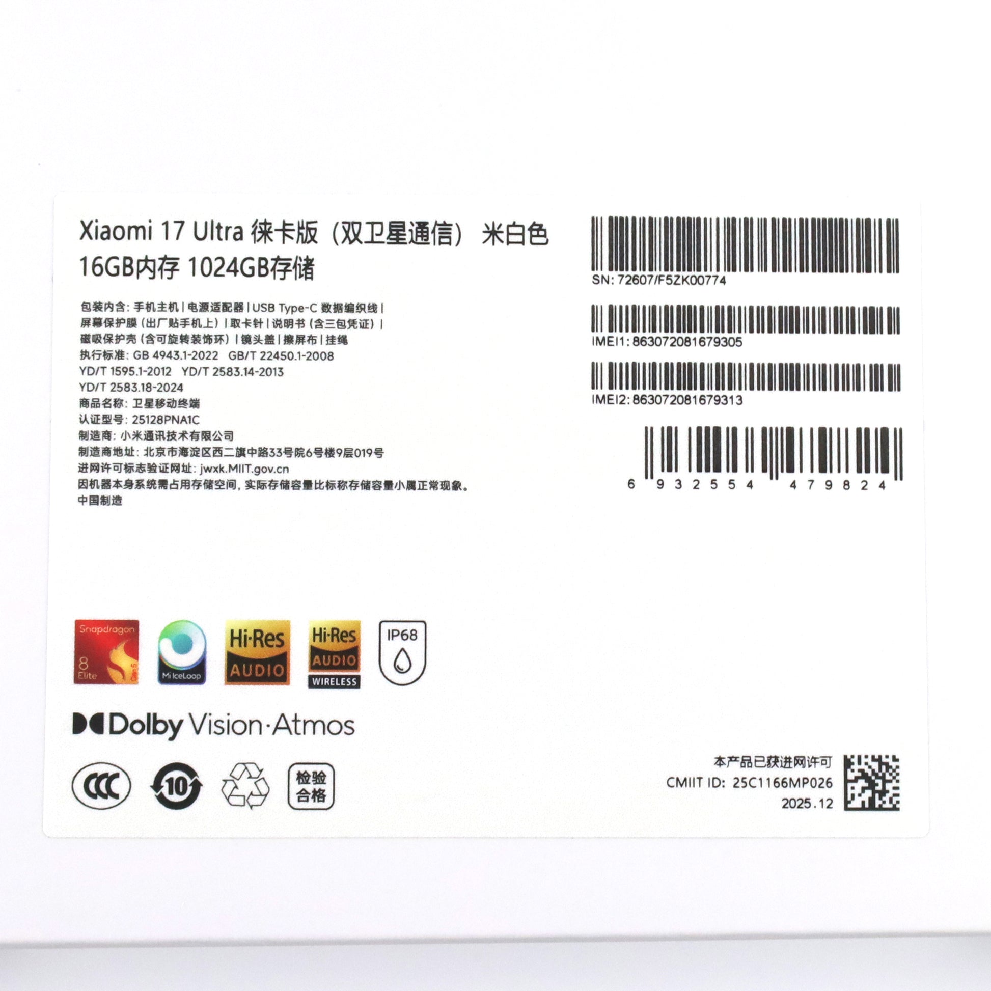 Aランク Xiaomi 17 Ultra Leica Edition 16/1024GB White 25128PNA1C 中国版【90日保証】